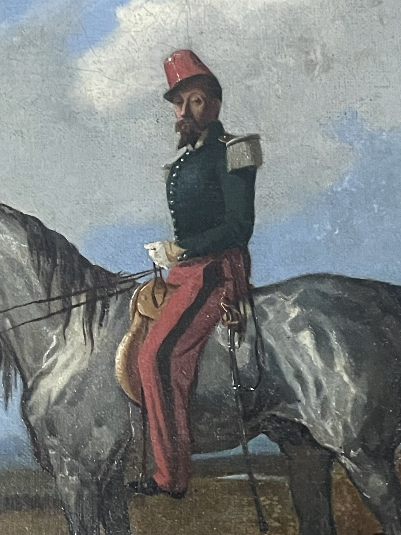 Le décor, la coiffure et l’attitude générale nous suggèrent la cavalerie d’Afrique vers 1840/50.